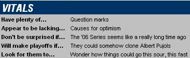 Analysis: Well, that was quick. One year after a surprise World Series victory, and two years removed from back-to-back 100-win seasons (the culmination of a run of 6 straight 85+ win campaigns), the Cardinals' roster now bears little resemblance to the perennial contender that former GM Walt Jocketty built in the first half of the decade. The problem with declining teams like this is usually aging, but that's not really the case here -- St. Louis was generally a veteran-laden outfit throughout Jocketty's tenure, while the 2008 opening day lineup features only 2 players (Troy Glaus, Adam Kennedy) over age 30. No, the Cards' problem isn't that they're getting older, it's just that their stars are injury-prone, plus the younger players they've brought in over the past few seasons aren't very good and they're already in their primes (meaning they're not going to get any better). Aside from the incomparable (but injured) Albert Pujols, St. Louis' only above-average hitters are Glaus, Chris Duncan, and maybe Ryan Ludwick, Josh Phelps, & rookie Brian Barton -- maybe. Otherwise, this offense is littered with a lot of Cesar Izturis types, which isn't exactly the greatest formula for scoring runs (especially if Pujols' torn elbow ligament hampers his performance or costs him playing time). St. Louis' pitching situation is equally tenuous; erstwhile ace Chris Carpenter is not slated to return from elbow surgery until midseason, and the rest of the rotation is either injury-riddled (Mark Mulder, Matt Clement) or flat-out pedestrian (Braden Looper, Joel Pineiro, Kyle Lohse, Anthony Reyes, et al). The bullpen is not all that bad, having posted a 4.00 ERA a year ago (NL average was 4.06), but there's little reason to hope that the starters and offense can give them meaningful leads to defend. The bottom line: with this team in full decline, look for the 2006 World Series to become more and more of a distant memory for Cards fans as the 2008 season goes on.