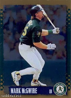 | By 1997, the mullet is no longer in style. (Please note that we are not implying that it was ever in style.) McGwire cuts it, and suddenly, all that's left is that immense amount of muscle. We think that if he, like that Giambi fellow playing at Yankee Stadium, never cut his hair, the world would never be the wiser. Minus points to Mark for the haircut—you blew your cover! Barry, on the other hand, is beginning to gain weight, and it's certainly not in the form of brain cells. The quote on the card is a reference to the fact that he had only 33 homers in 1995. He had 42 in 1996—and 40 steals. For what that's worth.